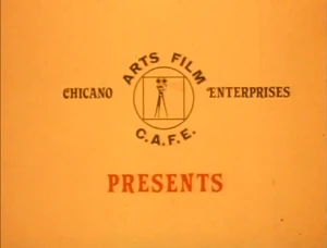 Visuals: Fading in from an orange background, there is a thin maroon ring, showing pre-recorded footage of a snake resting in a grassy landscape. Arched above the right is black, bold, sans serif “C.A.F.E.” with an additional outline surrounding it making a light brown outline for the text. After nine seconds, the logo fades into a maroon colored camera inside an outlined square, with an outlined ring over it as well, all maroon colored. “ARTS FILM” is arched on top of the ring, with the light brown outline surrounding it, as well as “C.A.F.E.” below it. Between it is black western serif “CHICANO” at the left, and “ENTERPRISES”, with an orange western serif “PRESENTS” below the logo.
