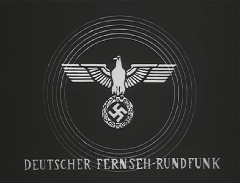 Visuals: On a black background are three circles with a stylized eagle on top of a small wreath-like ring with a Nazi symbol inside it. Under the big ciclre is the text "DEUTSCHER FERNSEH-RUNDFUNK" ina Times New Roman-like font.