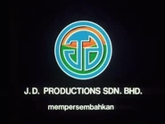 Visuals: On a black background, there is a aqua circle with a white outline over it, inside it is a abstract connected "JD" in the same style as the circle. Later, the circle insides get filles with a orange/green color with a thin wavy line, And the text "J.D. PRODUCTIONS SDN. BHD. mempersembahkan" with the "mempersembahkan" text under the company's name fades in under the circle.