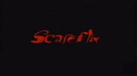 On a black background, there is a crudely drawn image of an angry person jump from the right corner of the screen, and starts snarling while moving its teeth and arms. It then zooms in closer to its face as it cuts to the text "ScareFlix" changing colors and sizes at a fast rate.