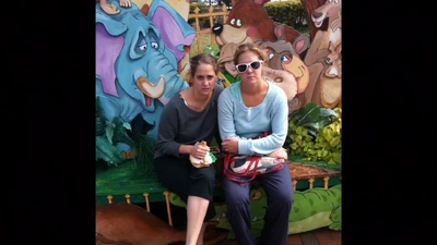 (April 30, 2013-September 7, 2020): There is a picture of Amy Schumer and Kim Caramele looking at the camera. Both Kim and Amy are holding purses; Kim holds is shaped like a sandwich. They are sitting on a colored bench behind the animals wall, as if they are at the zoo. The company name doesn't appear.