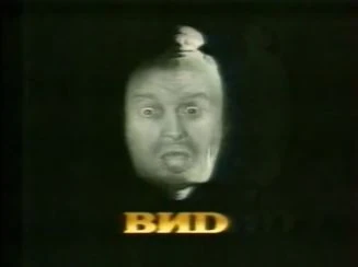 - October 25, 1990-1995: On an off-white background, a thick black line moves onto the screen from the left side, going right. It begins vibrating horizontally as it continues moving, and then a gray ball comes in from the left and begins bouncing along the line at a fast pace. It then falls off as the line stops moving. Then it cuts to a large close-up of the ball from a bird's eye view as it falls down into the center and disappears. Two closely-spaced black rings then shoot out from the center of the screen, which is immediately followed by a black circle that fills the screen to create a black background. Then, a stone mask, which is of Chinese Taoist philosopher Guo Xiang and a three-pawed toad sitting on top of his head, fades in. Finally, "ВИD" fades in and shines underneath in large bronze letters, which is Russian for "VID", although it uses a Latin "D" rather than a Cyrillic "Д", resulting in the text looking like "BND".