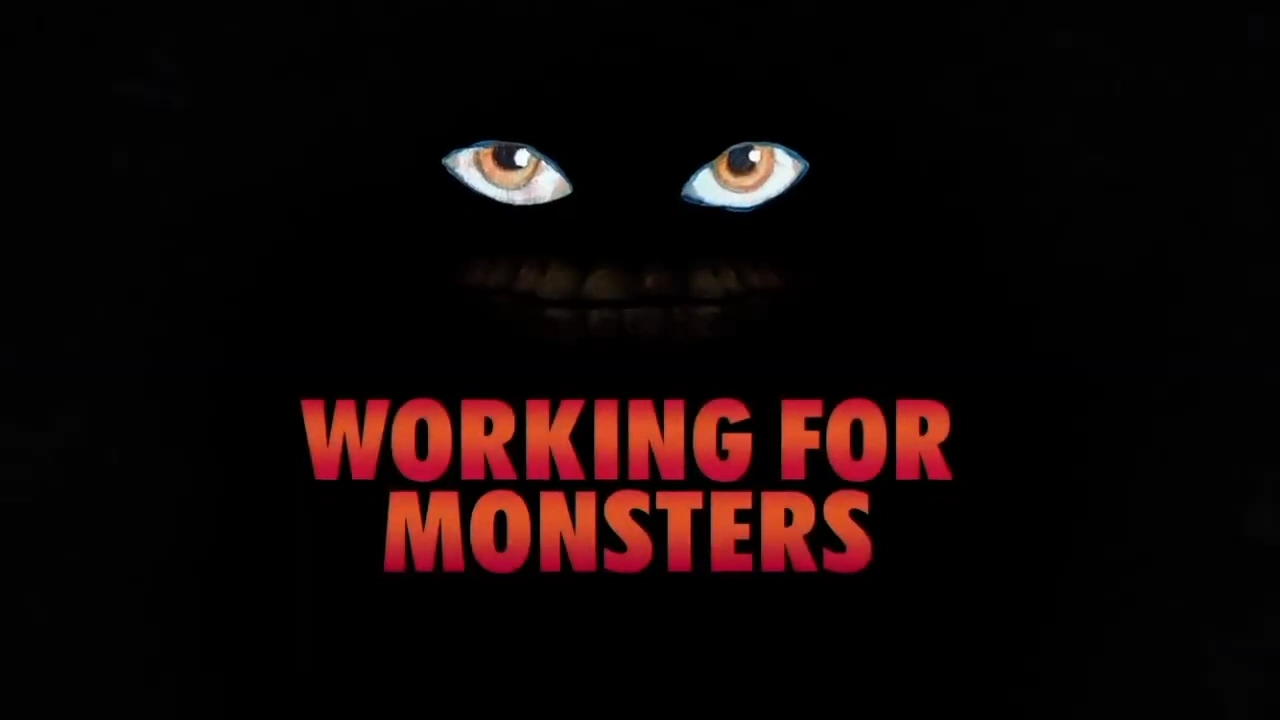 (May 20, 2012-December 12, 2013): On a black background is the stacked text "WORKING FOR MONSTERS" on the bottom. A pair of orange eyes appears on a black colored body, as well as teeth a second after, forming a face with a grin.